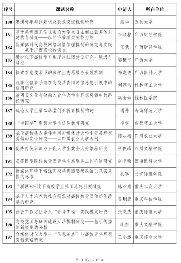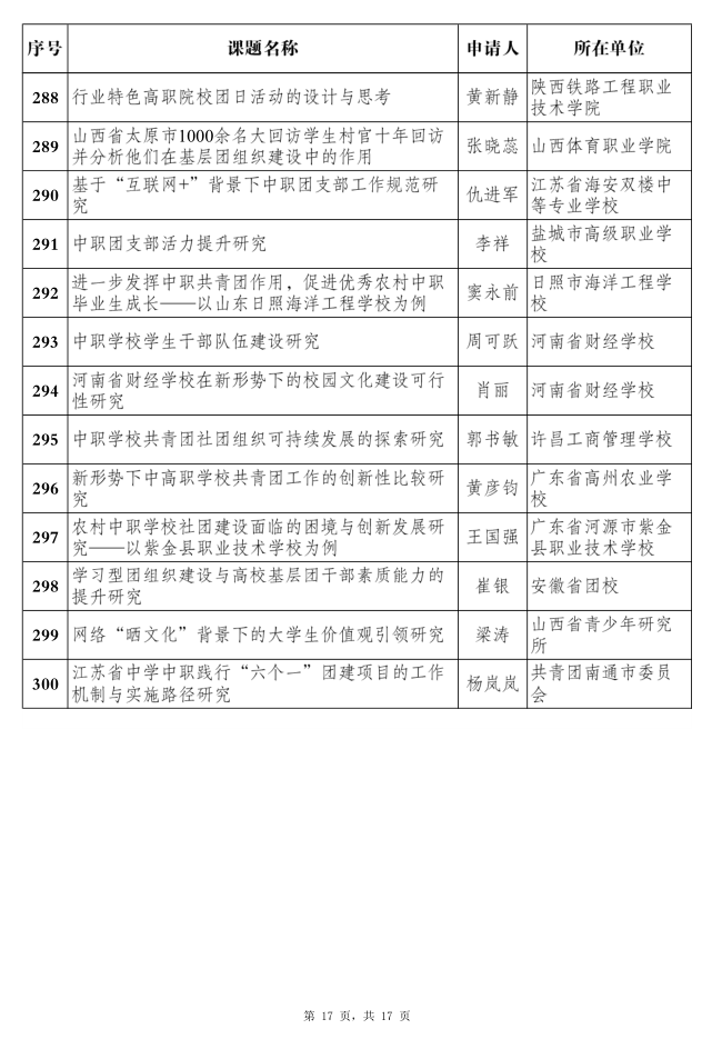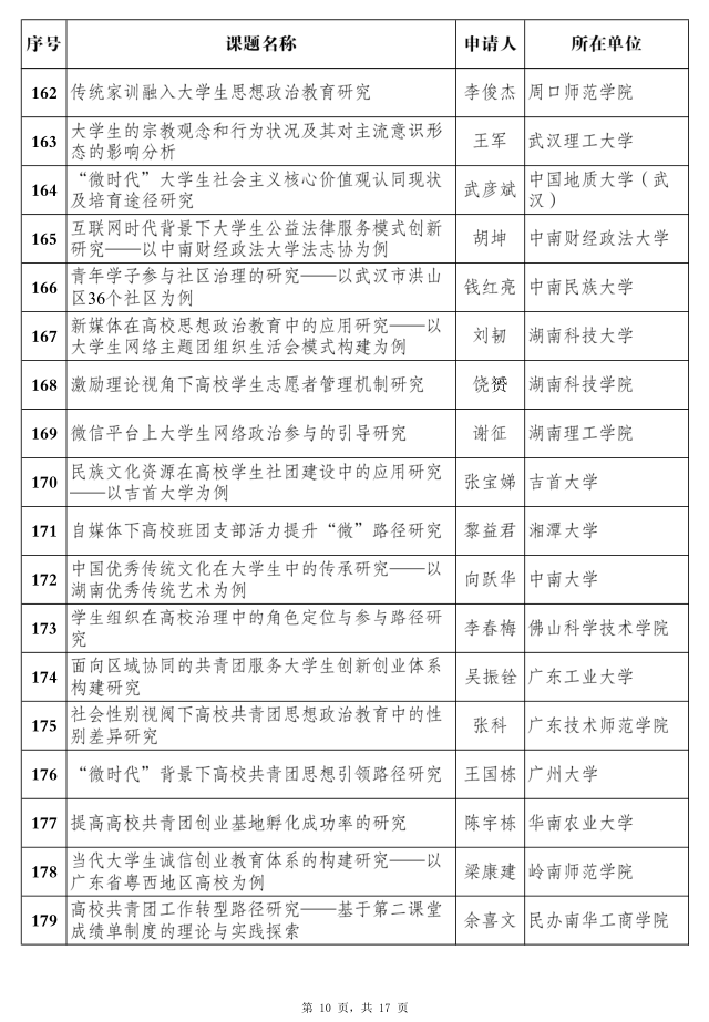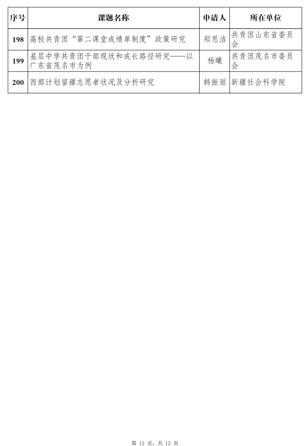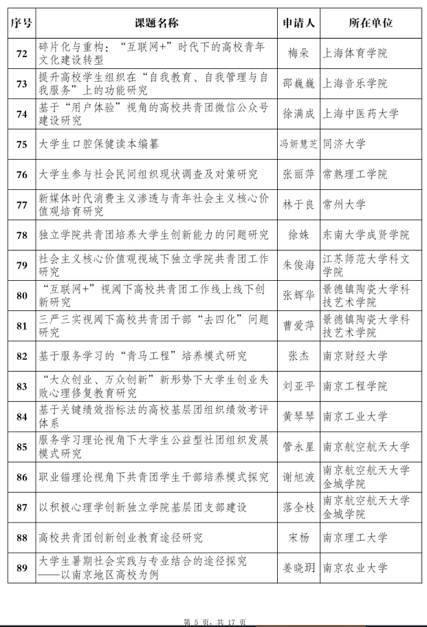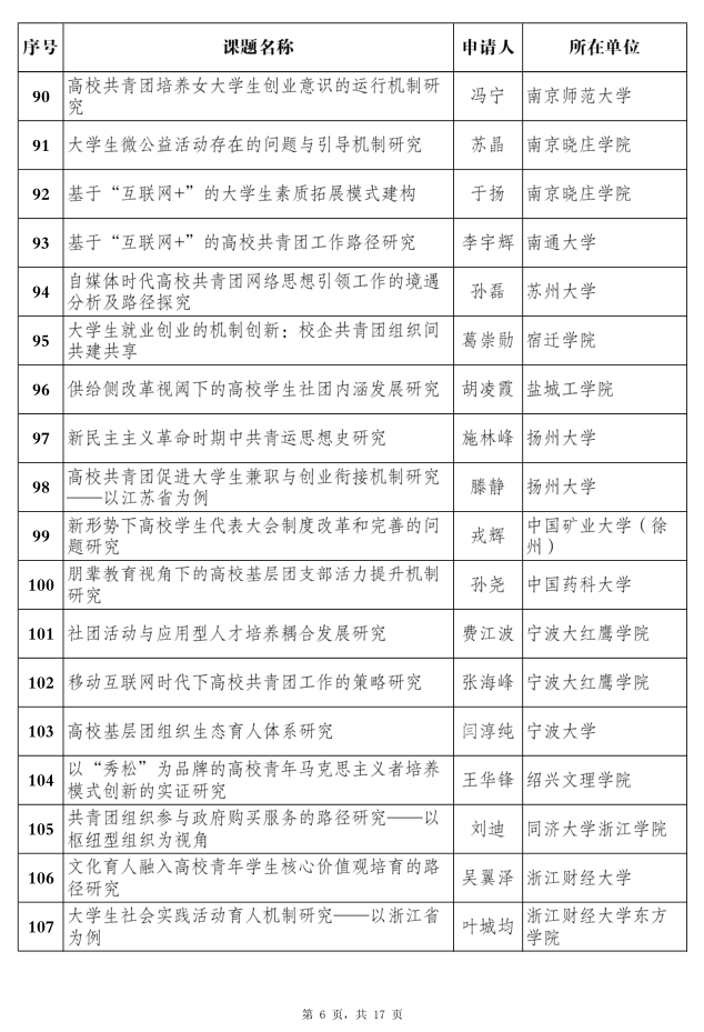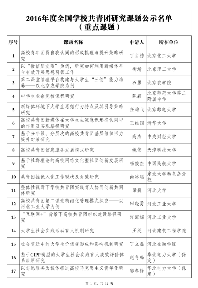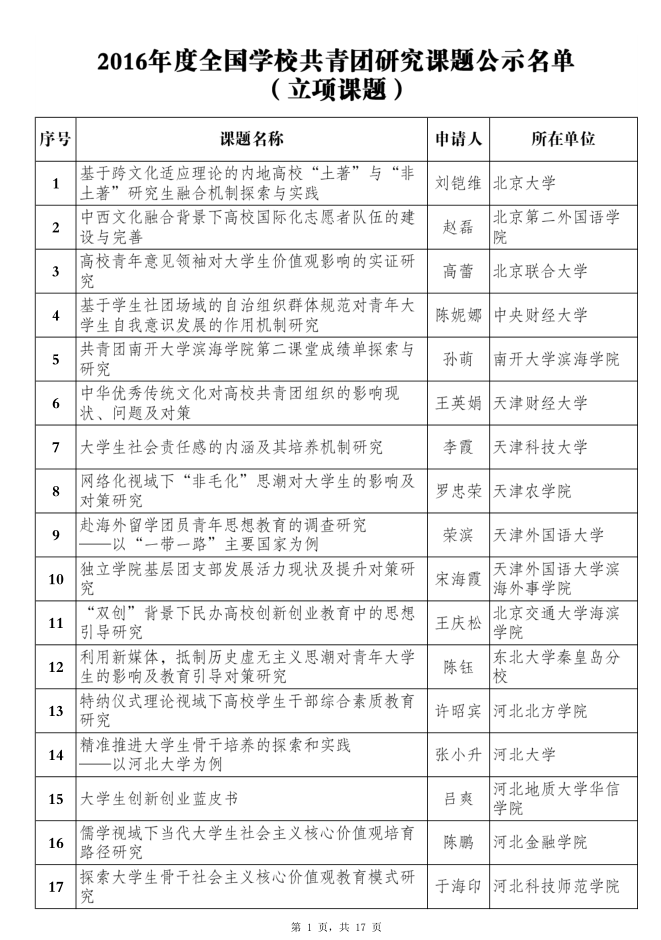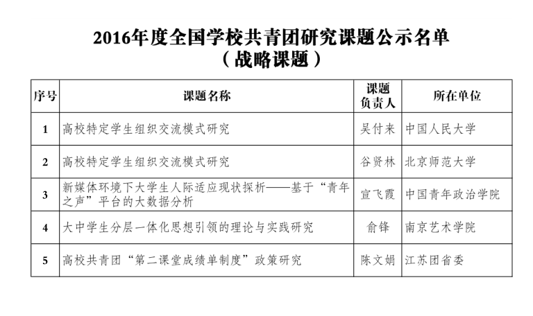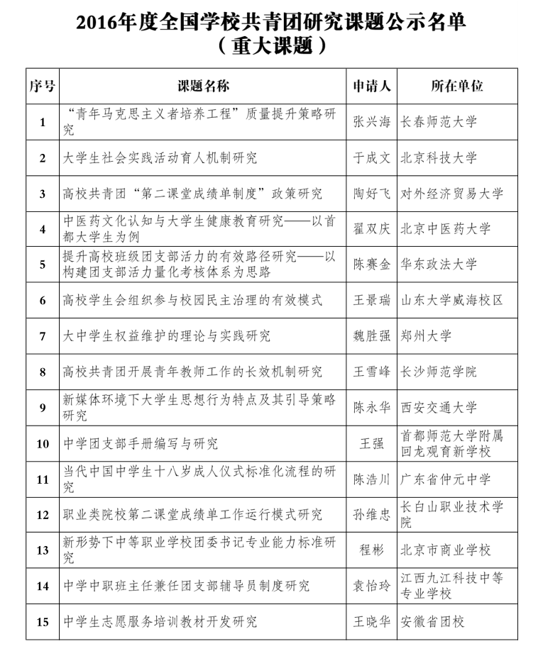根据共青团中央书记处相关批示精神和《关于申报2016年度全国学校共青团研究课题的通知》,共青团中央学校部、全国学联秘书处委托bet官网365.com组织开展2016年度全国学校共青团研究课题评审工作。经过资格审查,评审专家委员会初评、终评等环节,遴选出5项课题拟确定为战略课题、15项课题拟确定为重大课题,200项课题拟确定为重点课题,300项课题拟确定为立项课题。现将拟入选的课题予以公示,公示期为2016年6月20日至6月24日。